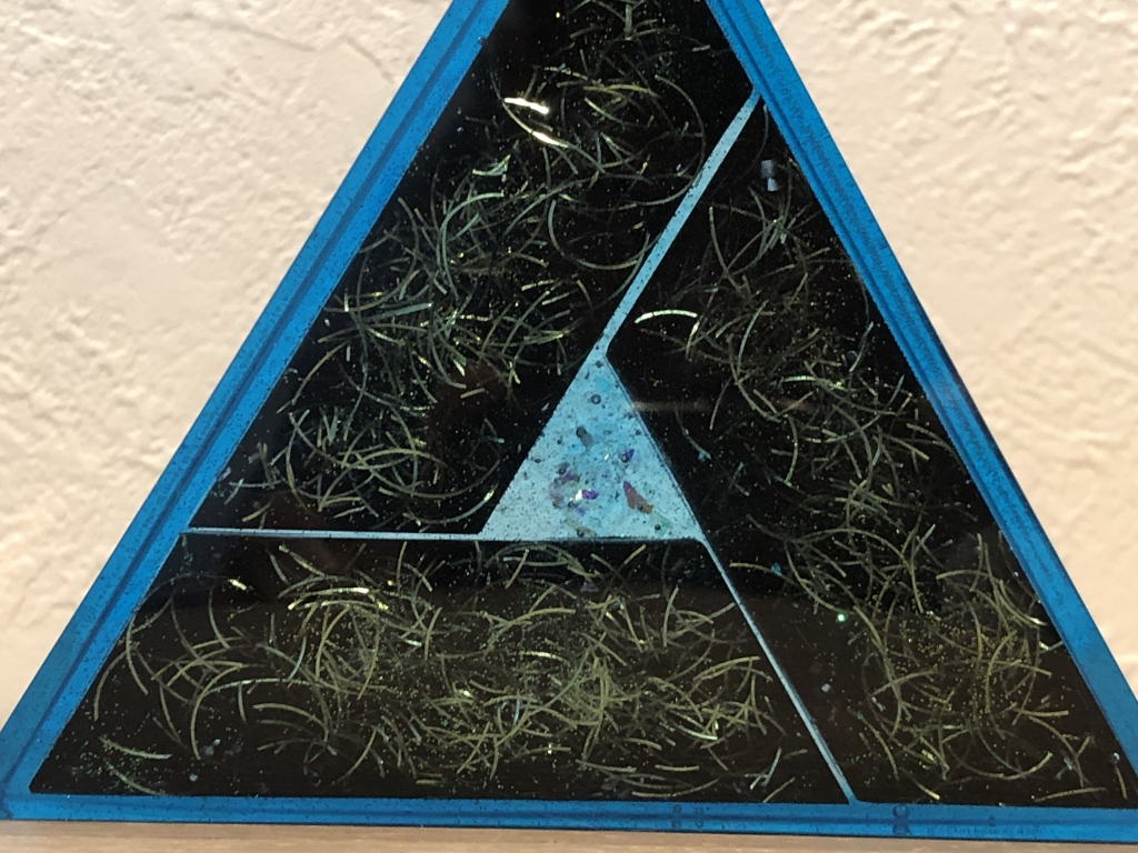 去年は三角の中窓があるバージョンだったんだけど、今年は3を意味するtriがテーマ。三位一体、天、地、人など新しいことが始まったり、創造されたりするには3つの要素が必要だと思ってて、今回そういうテーマで中の黒い三角形を、中窓の形も残しつつ3つのパーツに分解。中心の三角(これも3つの頂点)から一筋の透明なラインが外に伸びる。真ん中の三角に集まるエネルギーと3つの透明なラインが中心から放射される、そういうイメージで制作した。