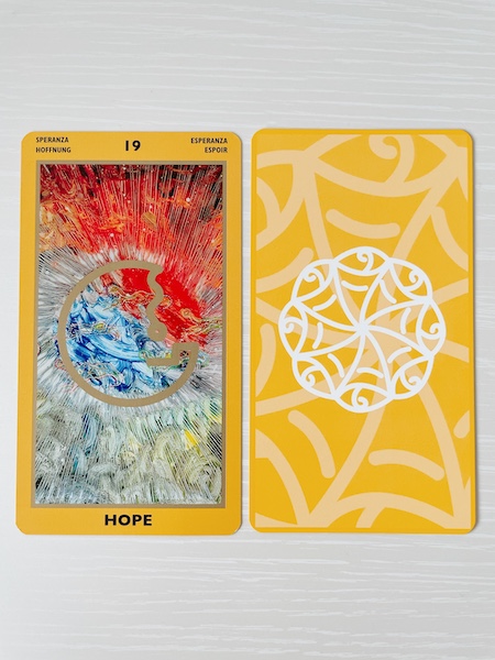 このカードはアート的にはドンピシャでした!それ以上にカードに書かれたシンボルに惹かれました。普通のオラクルカードの2倍位の値段なので一瞬は躊躇しましたが笑、衝動的にポチッとしてしまいました。メッセージは至ってシンプルです。解説書にも詳しく解説が書いてあるわけではありません。そのシンプルな一言から何を感じるかだと思いました。カードの絵は抽象的な中に、複雑にいろんなモチーフが隠れていて、どんな意味を内包しているか想像がどんどん膨らむ、そんなカードです。また一枚一枚金色のシンボルが描かれてあり、解説書によるとそのシンボルを指でなぞると良いとのこと。実際になぞってみると指先にビビビっって弱電流みたいな感覚あります。シンボルのパワーもありそうです。これはエネルギー転写というか視覚から、そして指先からもバッチリ入ってくる、そんな感じのカードです。さすがダマヌールです。